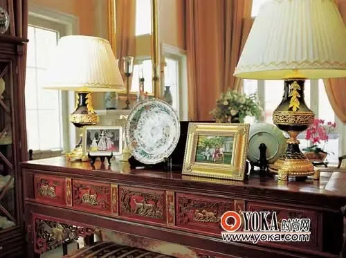 在作为正式用餐区和客厅分界的中式老柜上,摆放着家人的照片,如一道温暖的风景,让家人随时都能温习美好的记忆,幸福的瞬间。
